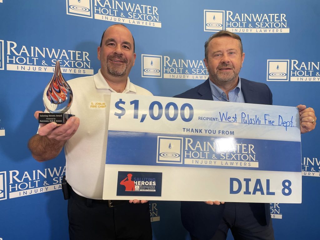 Rainwater, Holt, and Sexton and THV11 reached out to West Pulaski Fire Department to advise us we were this months recipient of the Saluting Heroes Award for service to our community. This is a wonderful award that strives to recognize the efforts of individuals and organizations that serve communities, families, and veterans.